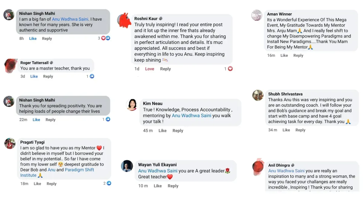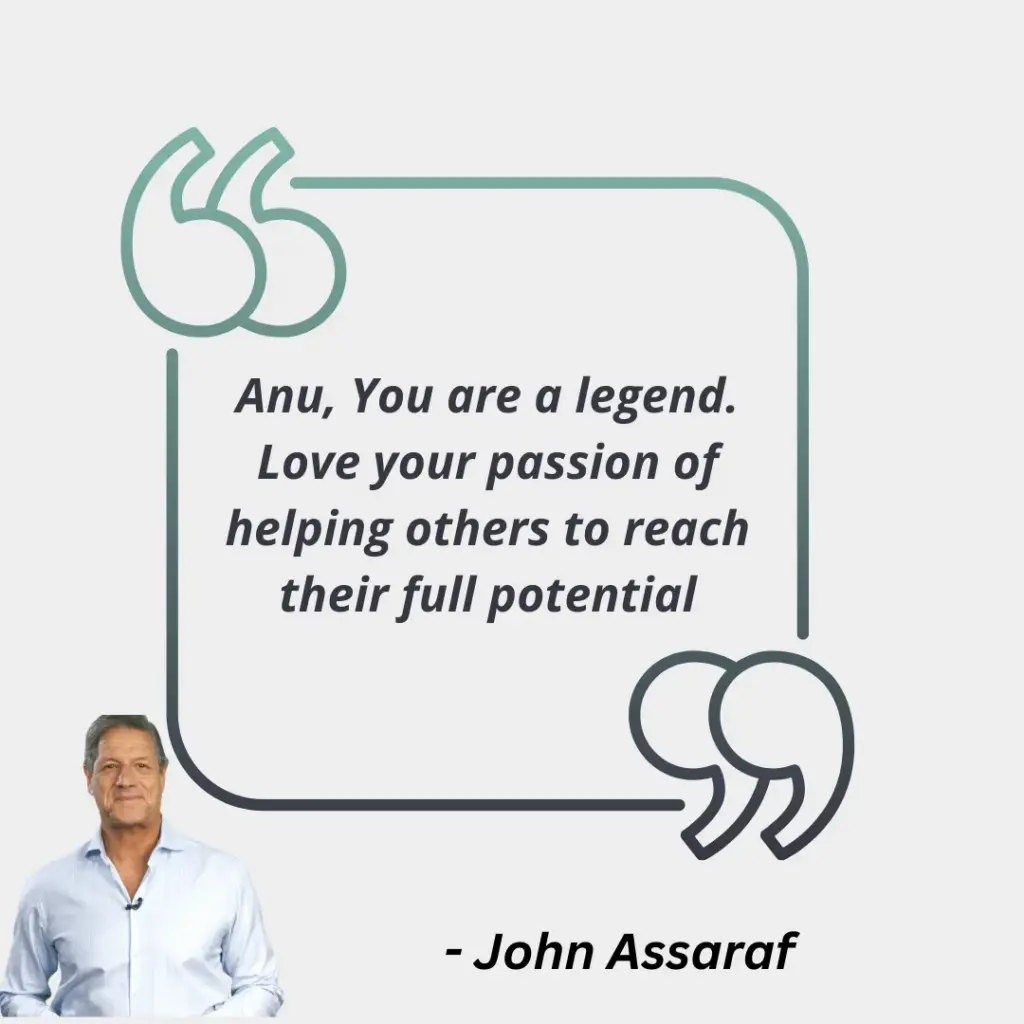 Also John Assaraf who is well known as an expert featured in the film & book ‘The Secret’, which focuses on the Law of Attraction. And it emphasizes that whatever consumes your thoughts will eventually attract into your life.He also said “Anu, You are a legend. Love your passion of helping others to reach their full potential.“