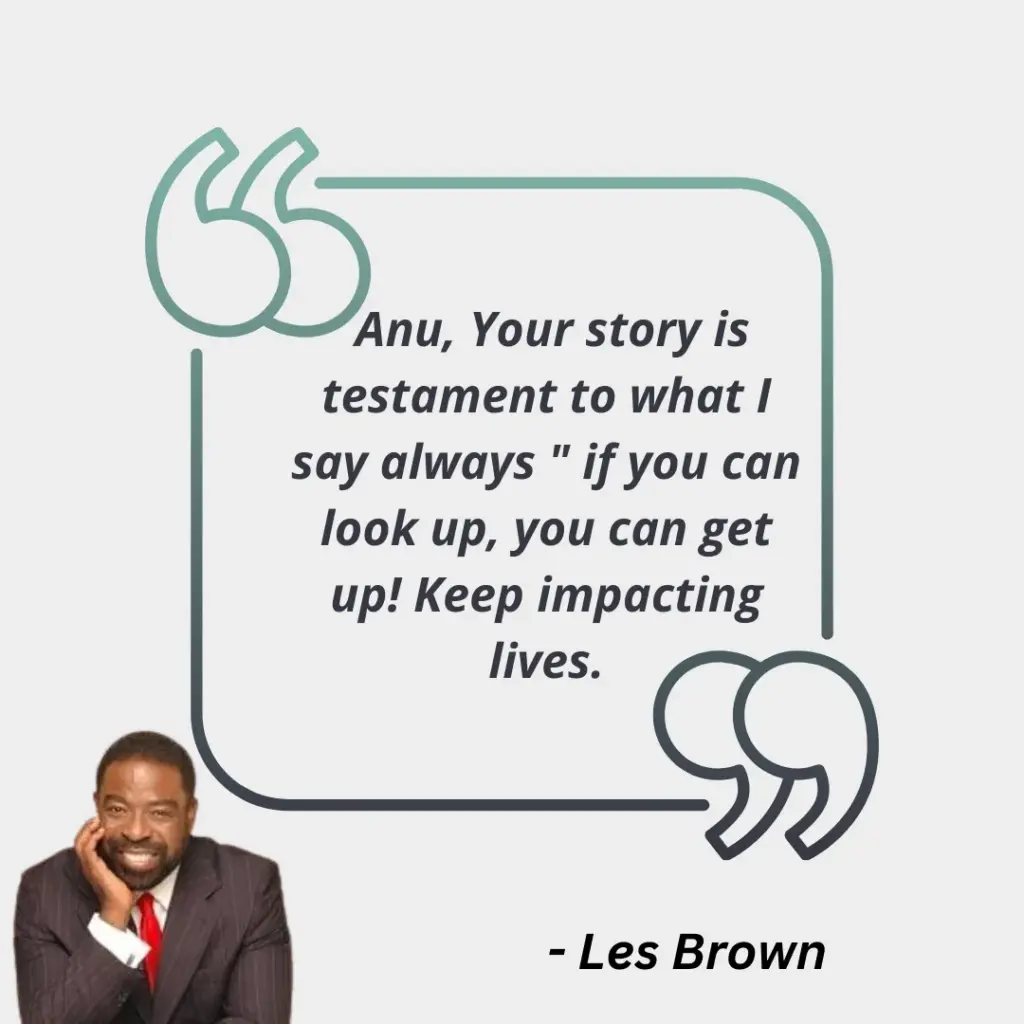 Les Brown who said this about her… Your story is a testament to what I say always “if you can look up, you can get up! Keep impacting lives.”